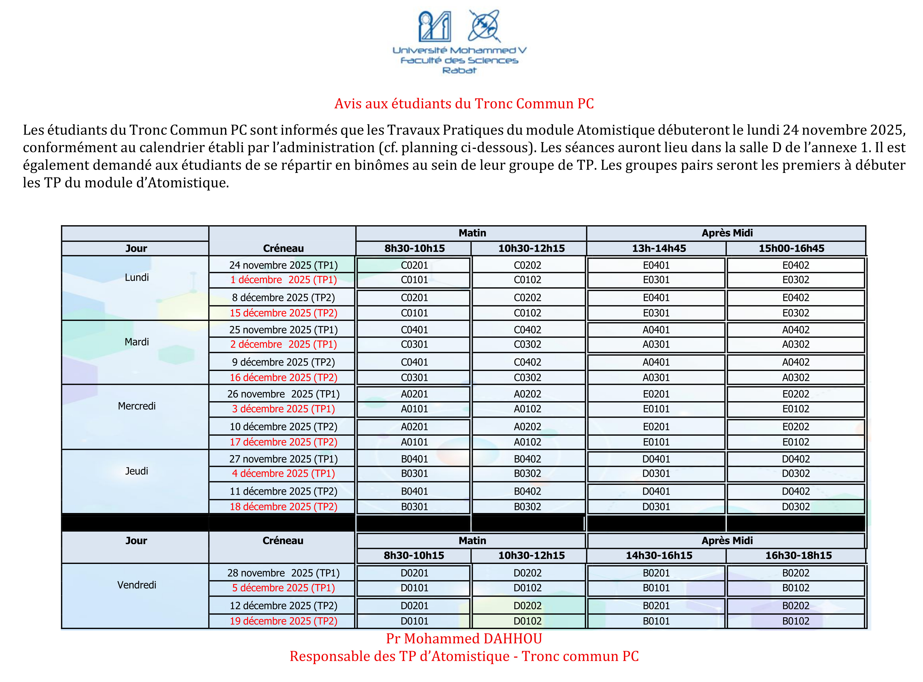 Les étudiants du Tronc Commun PC sont informés que les Travaux Pratiques du module Atomistique débuteront le lundi 24 novembre 2025,
