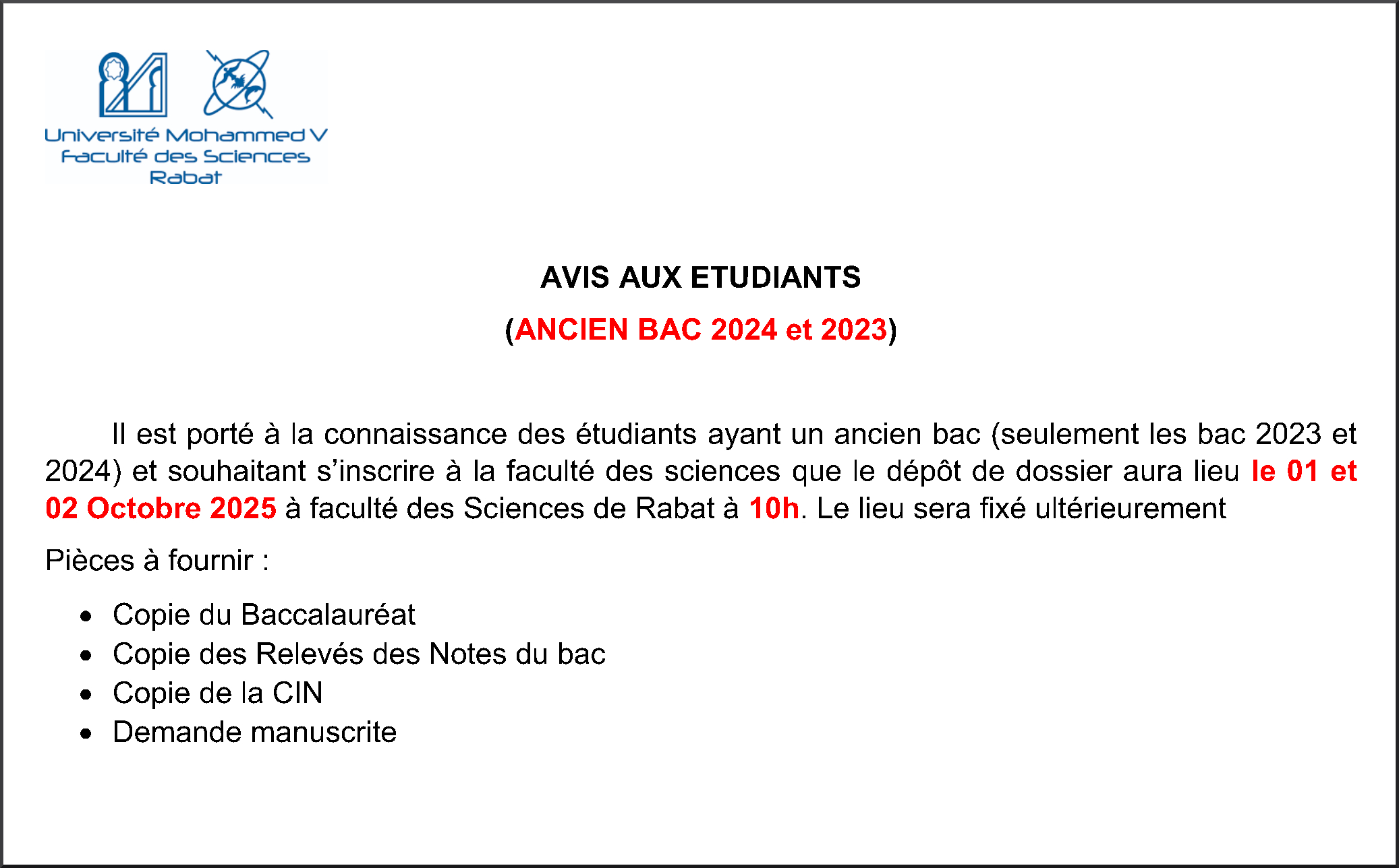Il est porté à la connaissance des étudiants ayant un ancien bac (seulement les bac 2023 et 2024) et souhaitant s’inscrire à la faculté des sciences que le dépôt de dossier aura lieu....