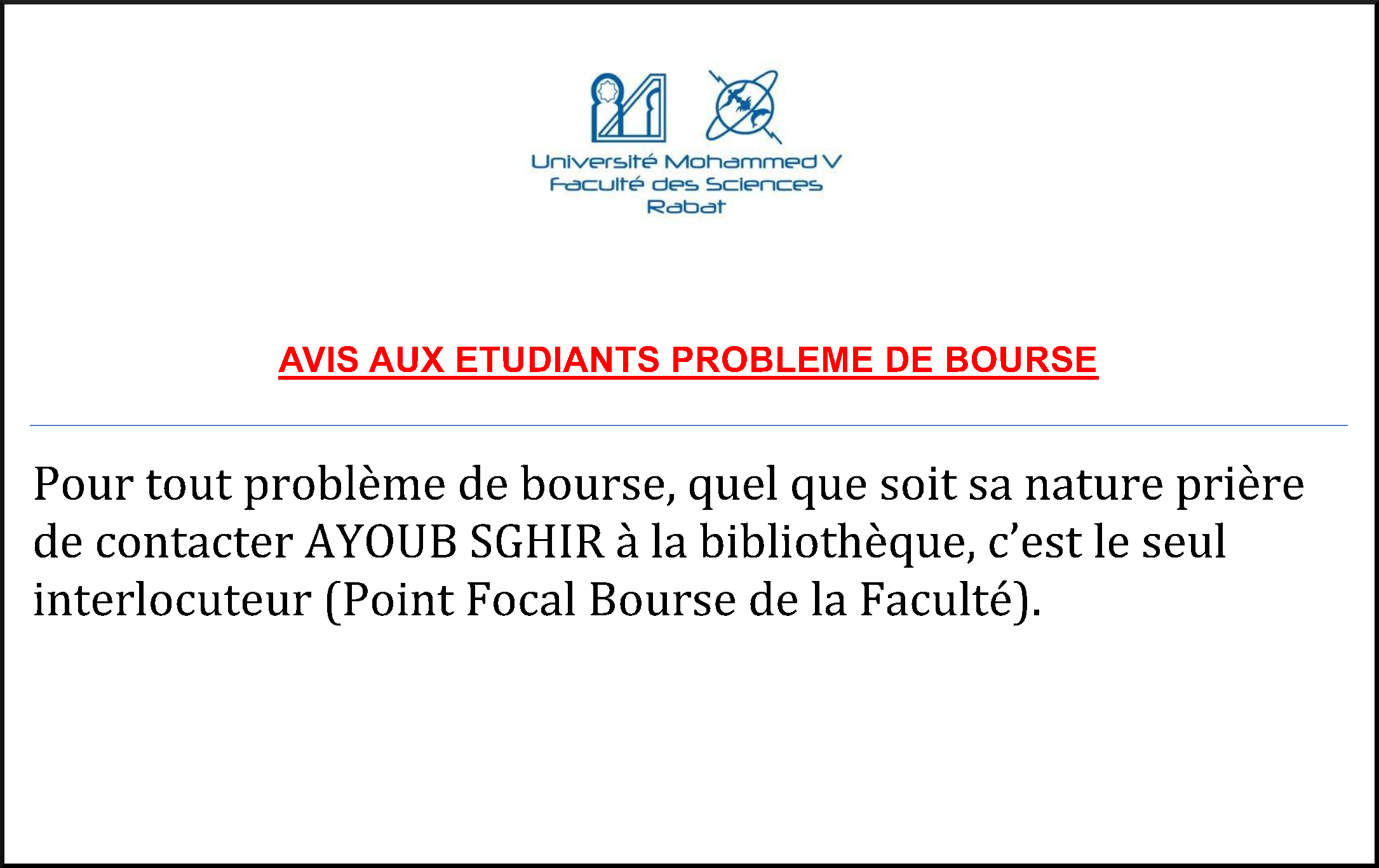 Pour tout problème de bourse, quel que soit sa nature prière de contacter AYOUB SGHIR à la bibliothèque, c’est le seul interlocuteur...
