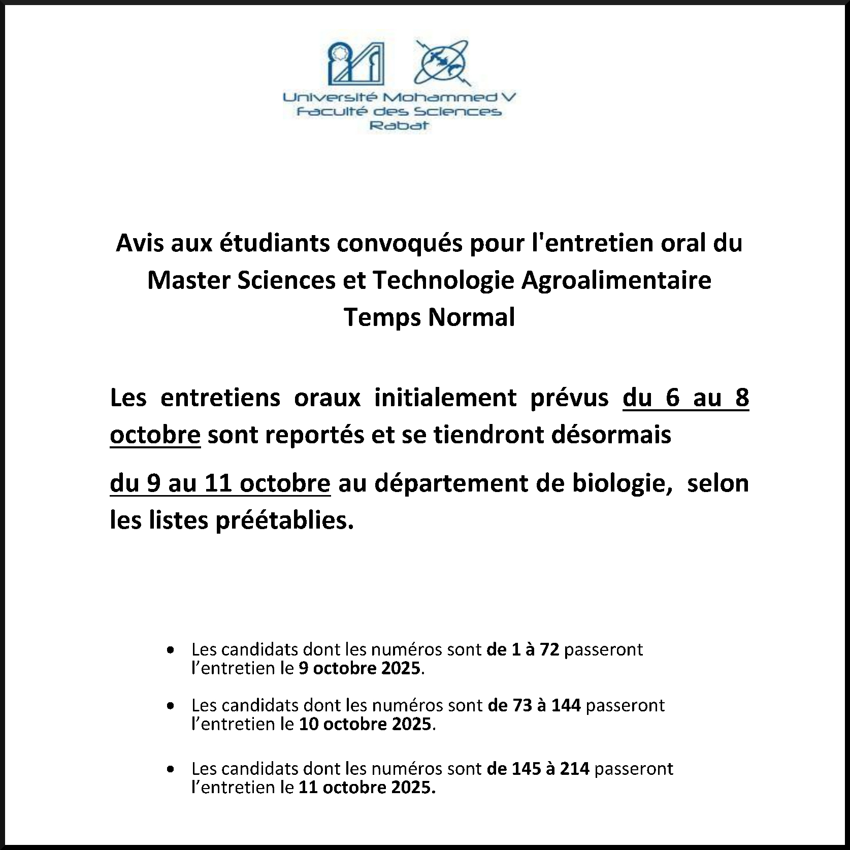 Avis aux étudiants convoqués pour l'entretien oral du Master Sciences et Technologie Agroalimentaire Temps Normal...