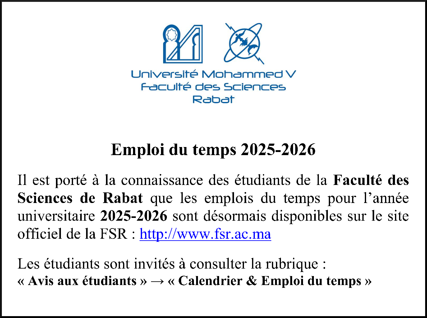 Il est porté à la connaissance des étudiants de la Faculté des Sciences de Rabat que les emplois du temps pour l’année universitaire 2025-2026 sont désormais disponibles...