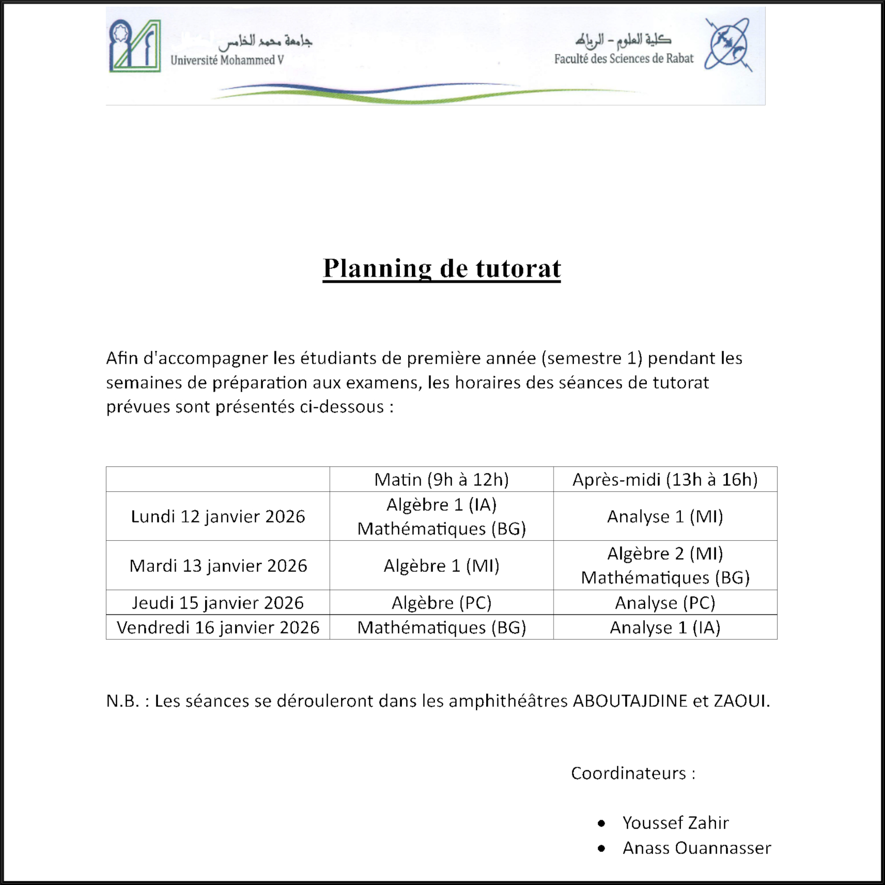 Afin d'accompagner les étudiants de première année (semestre 1) pendant les semaines de prépara9on aux examens, les horaires des séances de tutorat prévues sont présentés ci-dessous