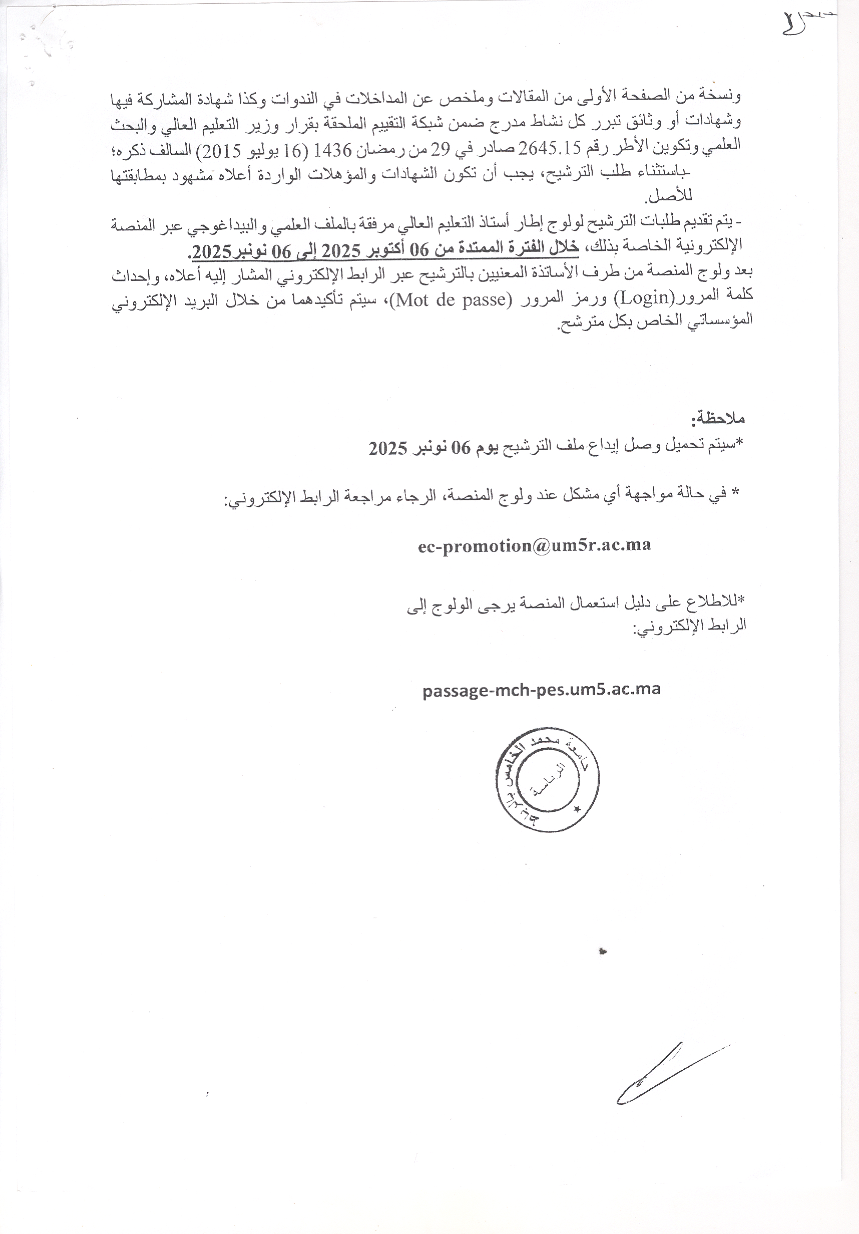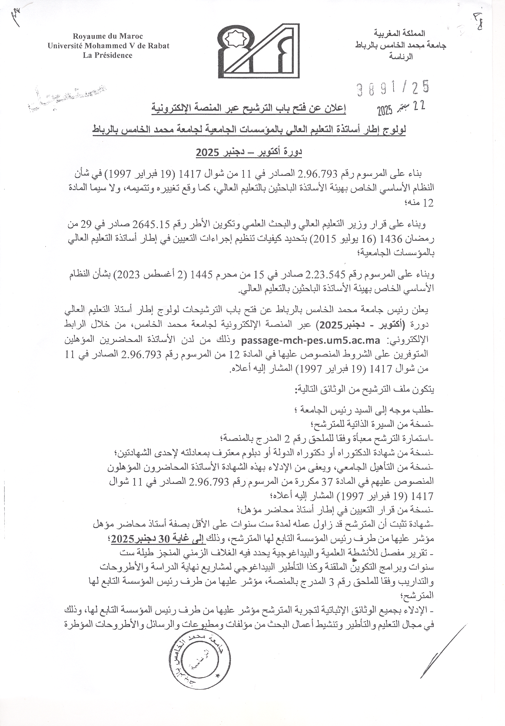 Le Président de l’Université Mohammed V de Rabat annonce l’ouverture des candidatures pour l’accès au grade de Professeur de l’enseignement supérieur (session octobre – decembre 2025) via la plateforme électronique de l’Université Mohammed V, à travers le lien suivant : https://passage-mch-pes.um5.ac.ma/....