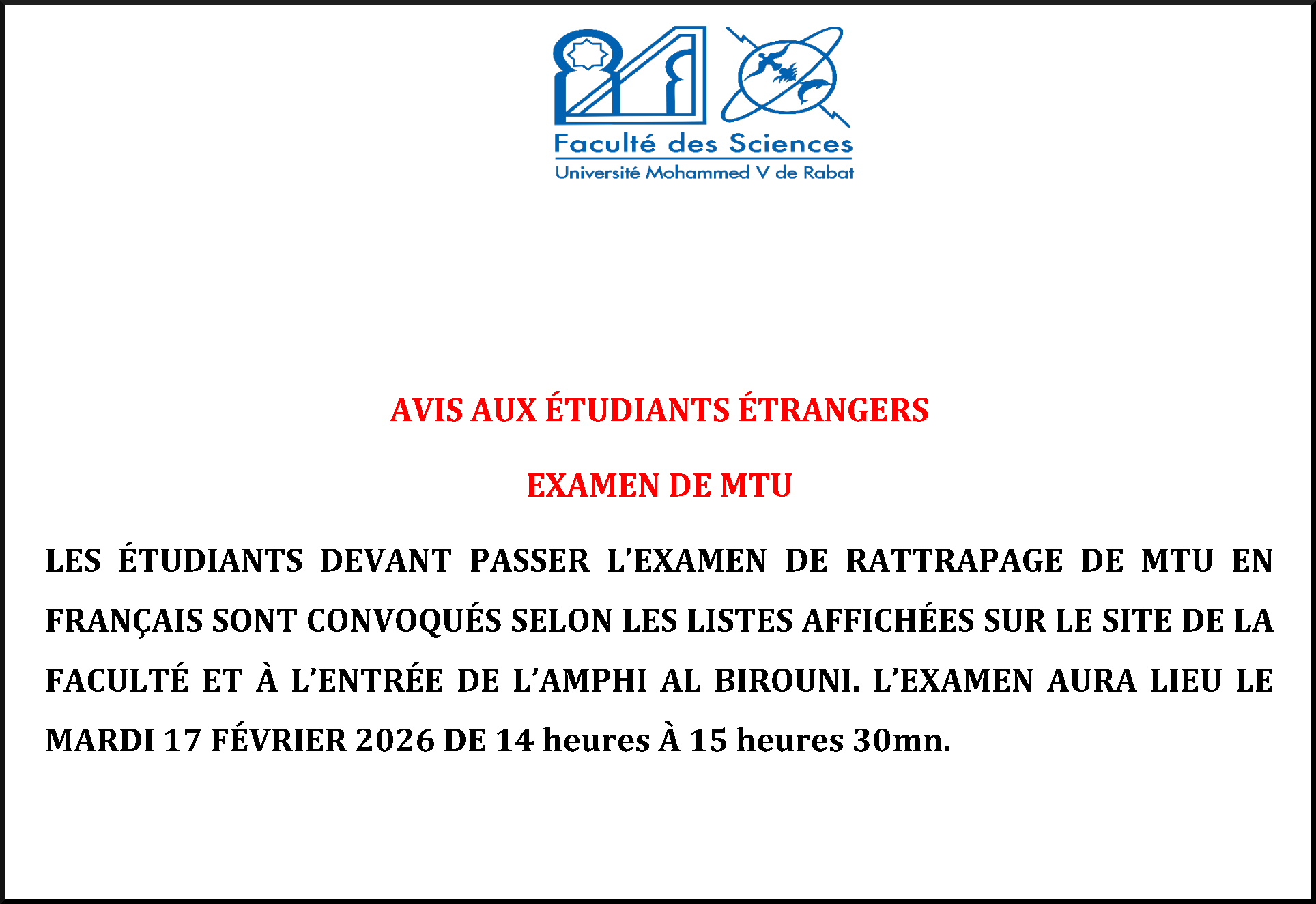 LES ÉTUDIANTS DEVANT PASSER L’EXAMEN DE RATTRAPAGE DE MTU EN FRANÇAIS SONT CONVOQUÉS SELON LES LISTES AFFICHÉES SUR LE SITE DE LA FACULTÉ ET À L’ENTRÉE DE L’AMPHI AL BIROUNI. L’EXAMEN....