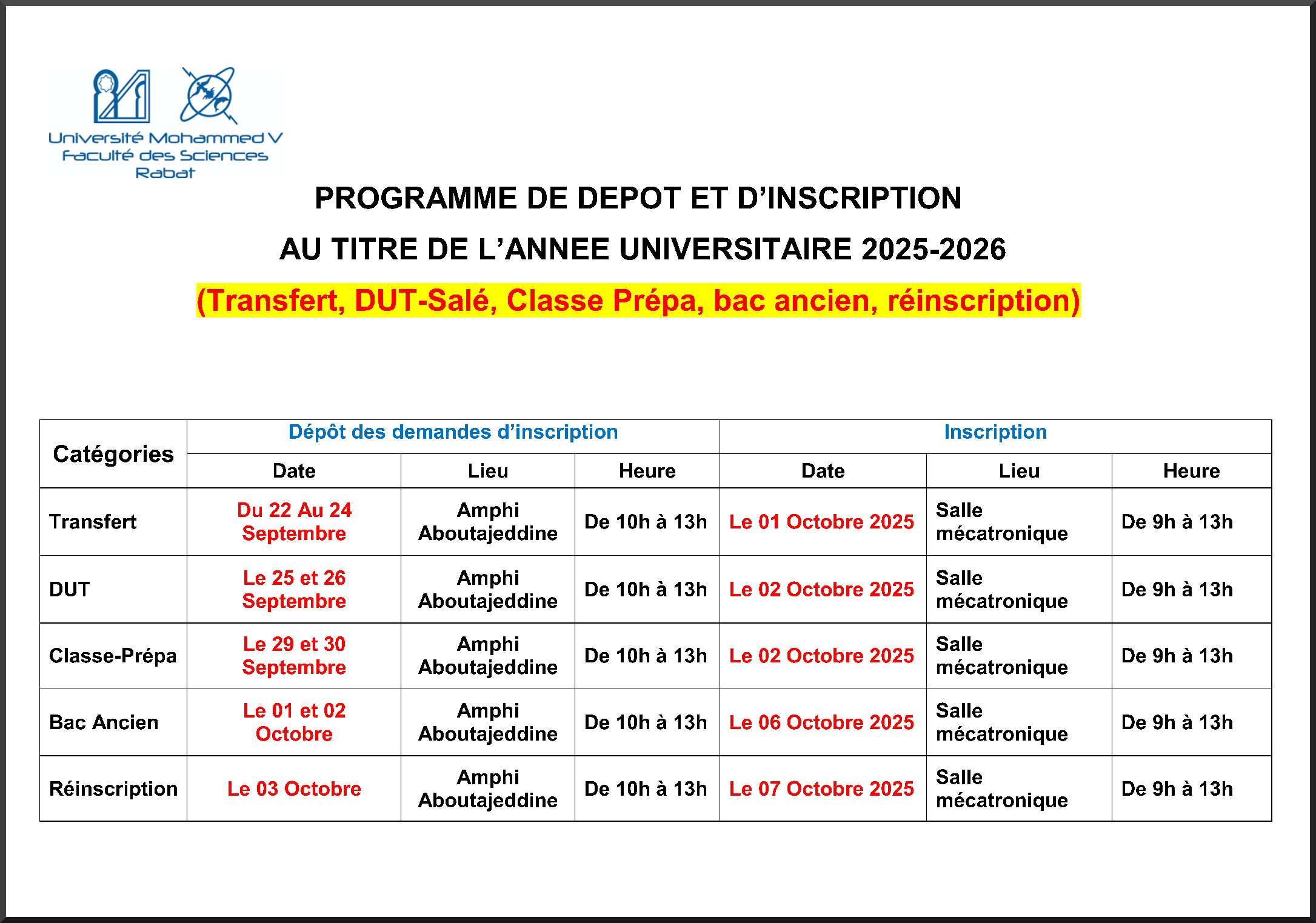 PROGRAMME DE DEPOT ET D’INSCRIPTION AU TITRE DE L’ANNEE UNIVERSITAIRE 2025-2026 (Transfert, DUT-Salé, Classe Prépa, bac ancien, réinscription