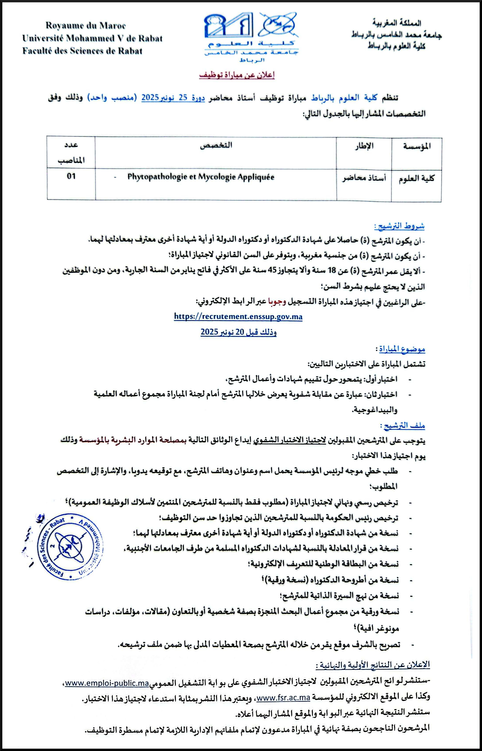 La Faculté des Sciences de Rabat organise un concours de recrutement de maitre de conférences session du 25 novembre 2025....